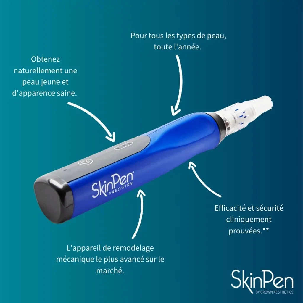 Le SkinPen®, un stylo innovant de microneedling, renouvelle la peau et réduit les cicatrices de différentes origines, offrant une peau de meilleure qualité et un aspect rajeuni. Approuvé par la FDA, il est cliniquement prouvé pour minimiser les rides du cou et les cicatrices d'acné faciales en créant des micro-perforations qui stimulent la guérison naturelle de la peau sans cicatrices.
